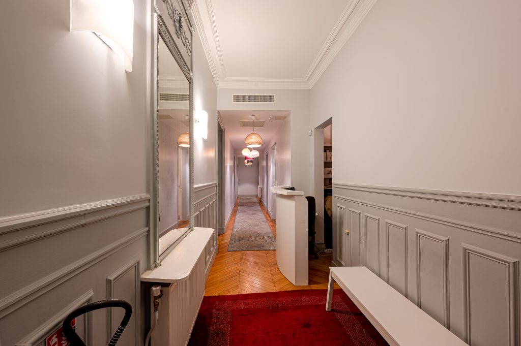 Bel appartement haussmannien dans lequel il a fallu intégrer toutes contraintes techniques du dentiste: stérilisation, autoclave, climatisation, moteur, pompes d’aspirations, points d’eau etc. Pas simple comme challenge lorsque l’on arrive dans une copropriété de la Plaine Monceau. Diplomatie et pédagogie font aussi partie de nos compétences.